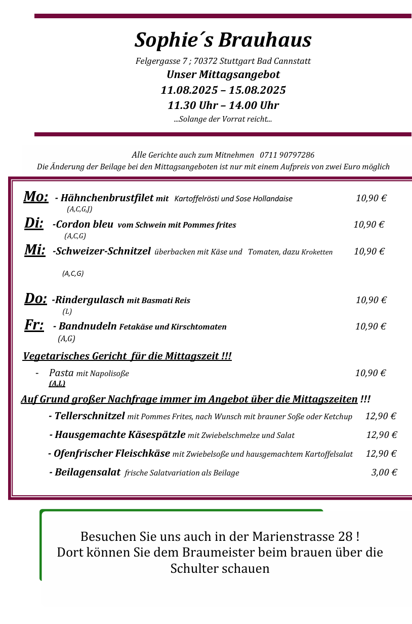 Die Reichhaltigkeit unseres Mittagstisches umfasst schwäbische Leckereien, nebst handfesten bayrischen Klassikern und für alle die bewußt essen möchten auch leichte Schlemmereien und vitale Kost.